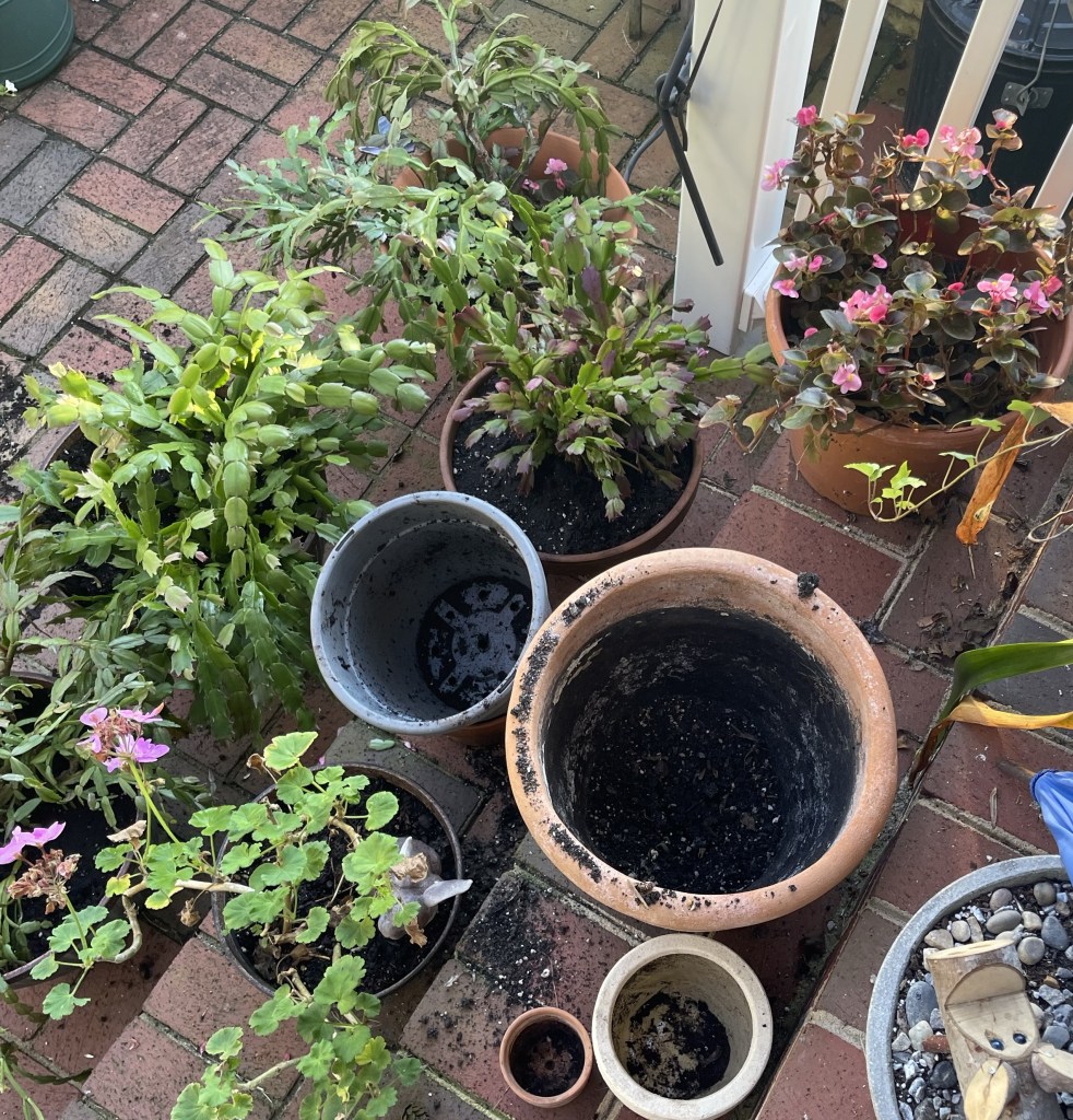 This year, I’m in the process of repotting a few plants prior to moving them indoors.