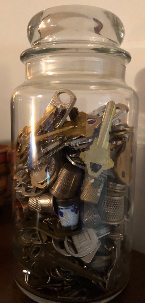 We have an old key 🗝 jar at our house. I think the origins of this container began from all the extra keys 🔑 we found while we were cleaning out Richard’s mom’s house several years ago. The consensus was that we shouldn’t throw them out yet because all the keys were not labeled, would we need them later???